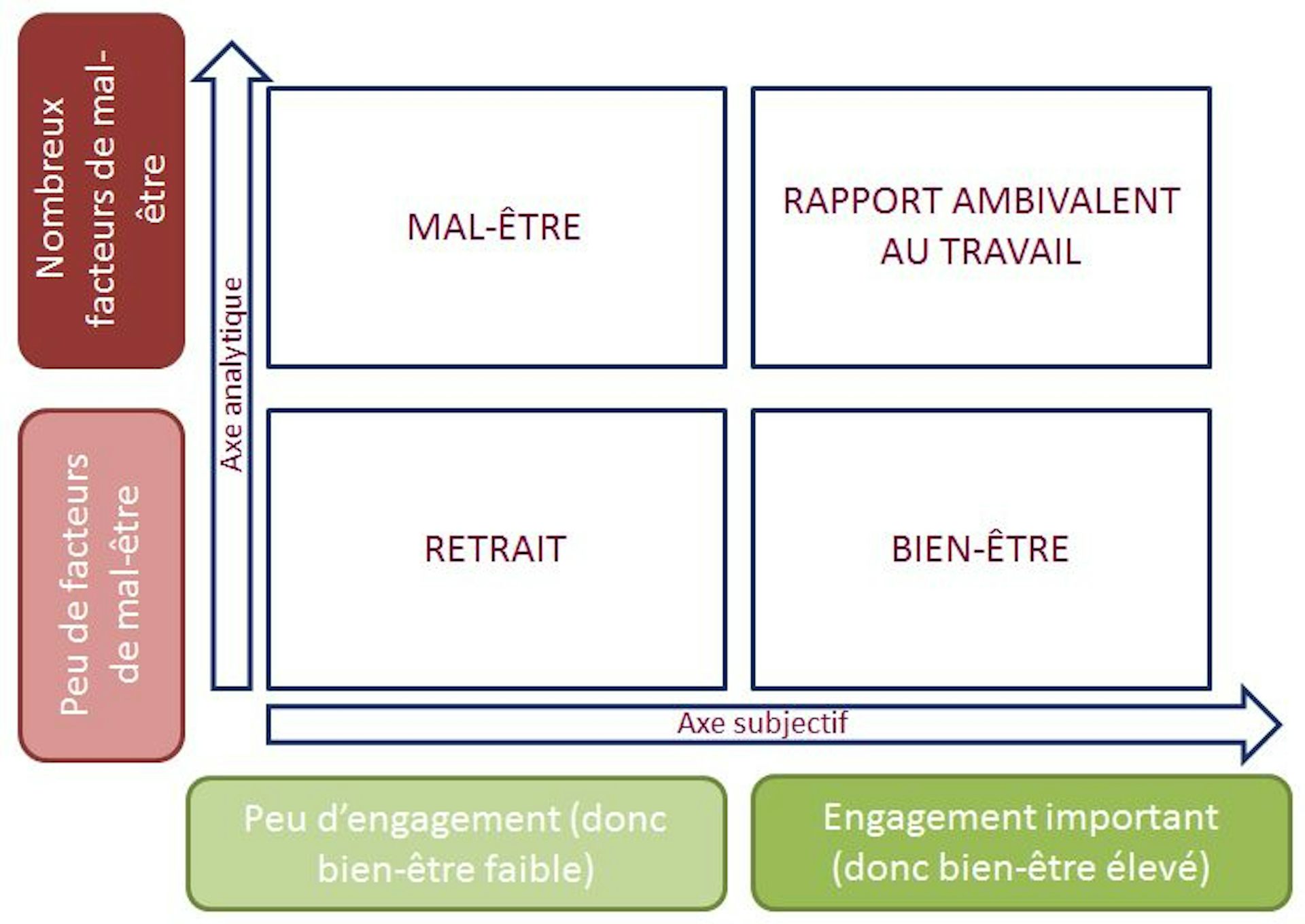 Selon nous, les différents modèles issus de la littérature scientifique, que ceux-ci se concentrent sur le bien-être ou sur le mal-être au travail, peuvent cohabiter. Il est ainsi possible de produire une catégorisation sous forme de quatre rapports au travail : le bien-être, le mal-être, le rapport ambivalent et le retrait. Nous avons proposé cette grille de lecture dans un travail de thèse, soutenue en 2015.